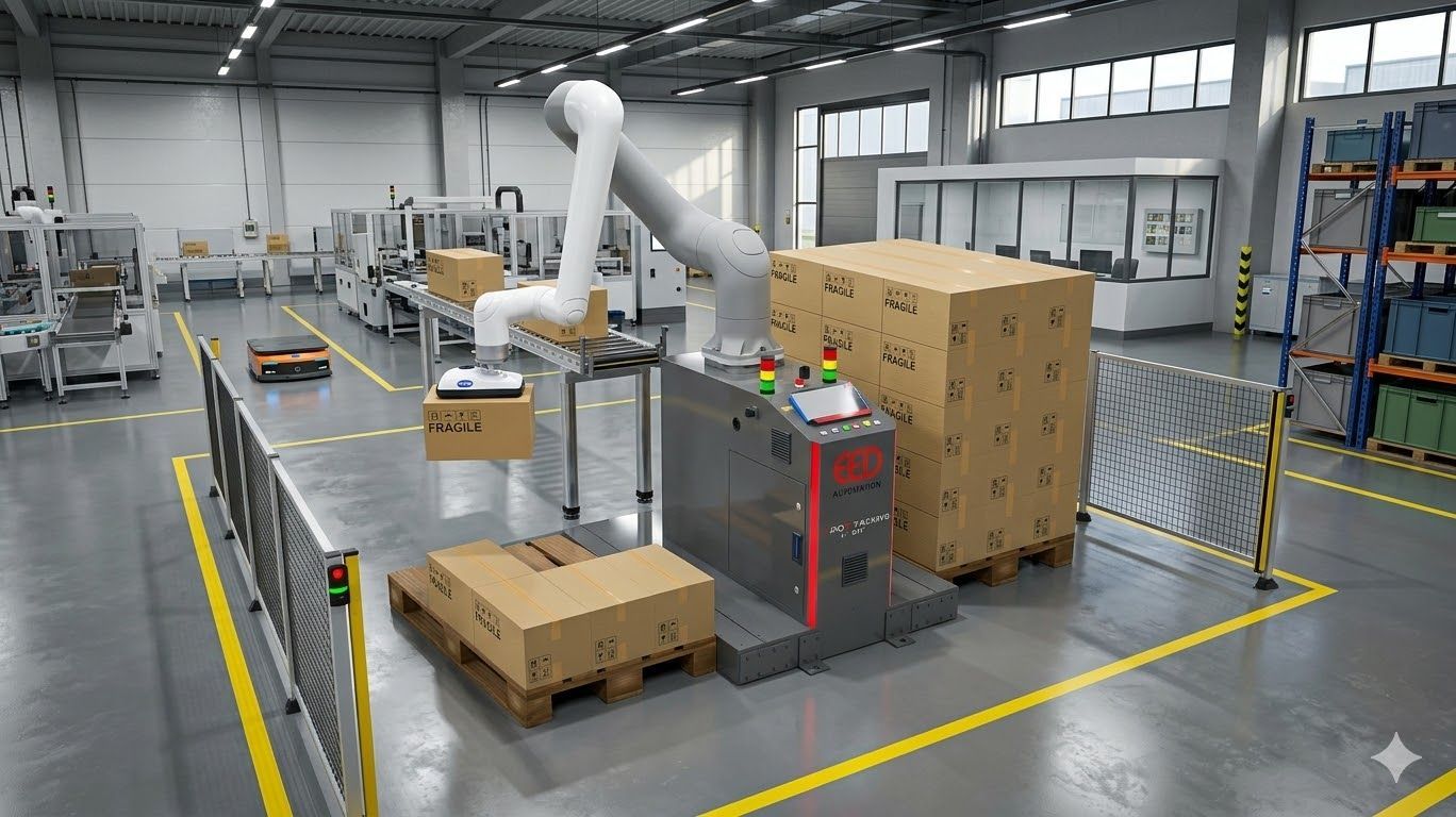 Unsere Cobot-Palettierstation entlastet Mitarbeiter von wiederholenden und anspruchsvollen Palettieraufgaben, was zu erheblichen Einsparungen bei den Betriebskosten führt.